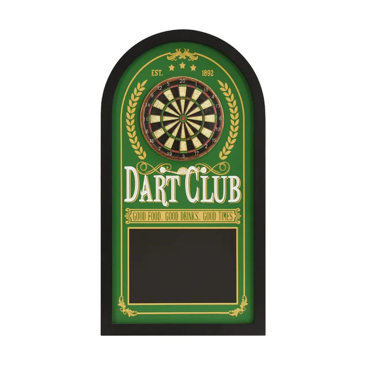 Designed for dart players, pub game enthusiasts, and anyone who appreciates timeless bar decor, this arched wall sign features a classic dartboard graphic and decorative chalkboard panel for added visual depth. While styled like a traditional blackboard, the chalkboard section is intended for decorative display rather than active writing.