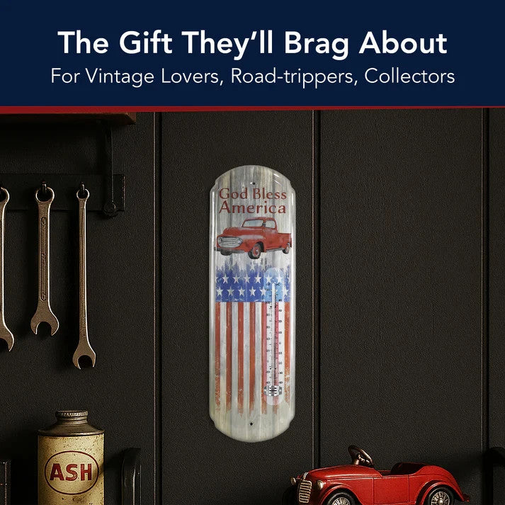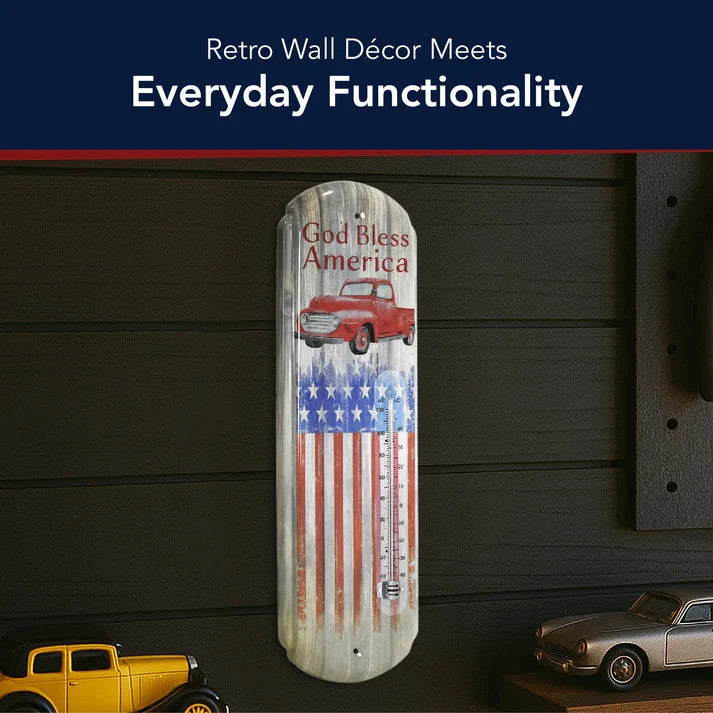 Celebrate American pride with this God Bless America Vintage Wall Thermometer, a functional piece of patriotic décor that blends rustic style with everyday practicality. Designed to resemble a distressed wooden plank, this vertical metal thermometer features bold red “God Bless America” lettering, a classic red pickup truck illustration, and a weathered American flag backdrop with vibrant stars and stripes.