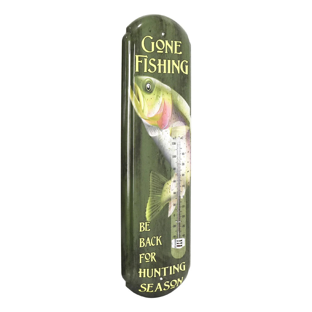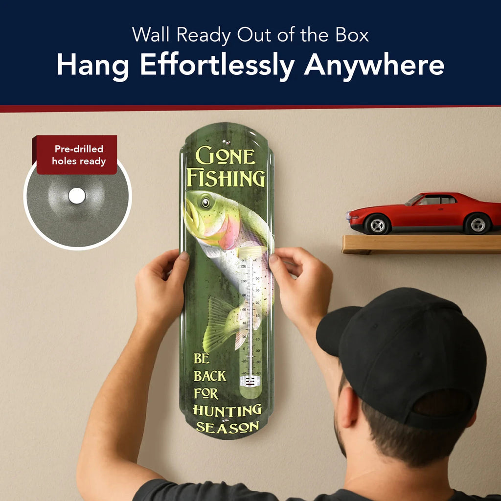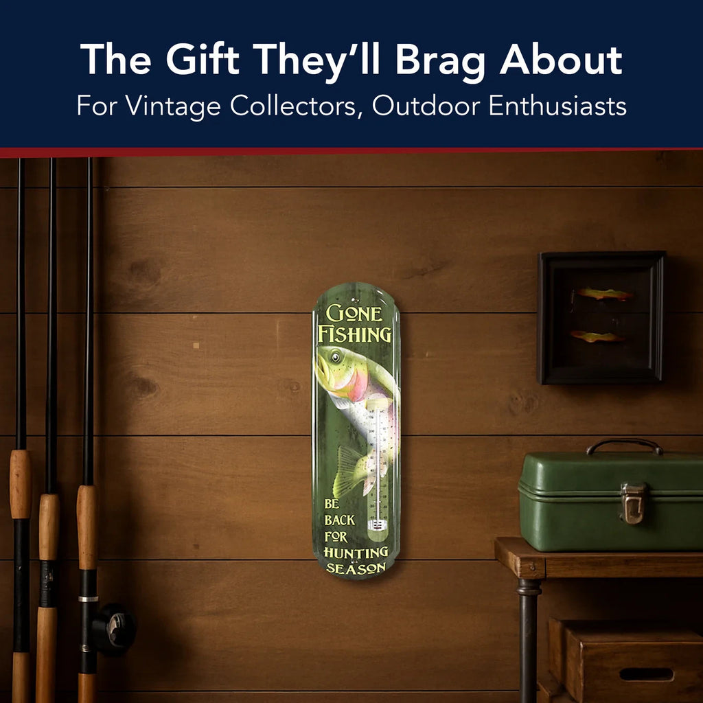 Bring the spirit of the outdoors inside. This officially licensed “Gone Fishing” thermometer sign features a vivid trout illustration, rustic green-brown patina, and the phrases “Gone Fishing” and “Be Back for Hunting Season.” It’s a perfect fit for porches, cabins, game rooms, garages, man caves, and hunting lodges.