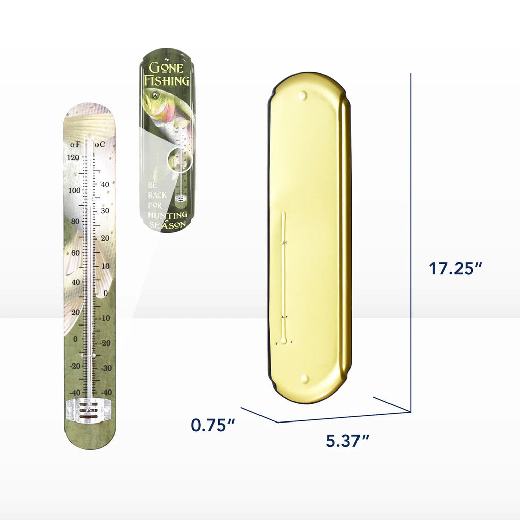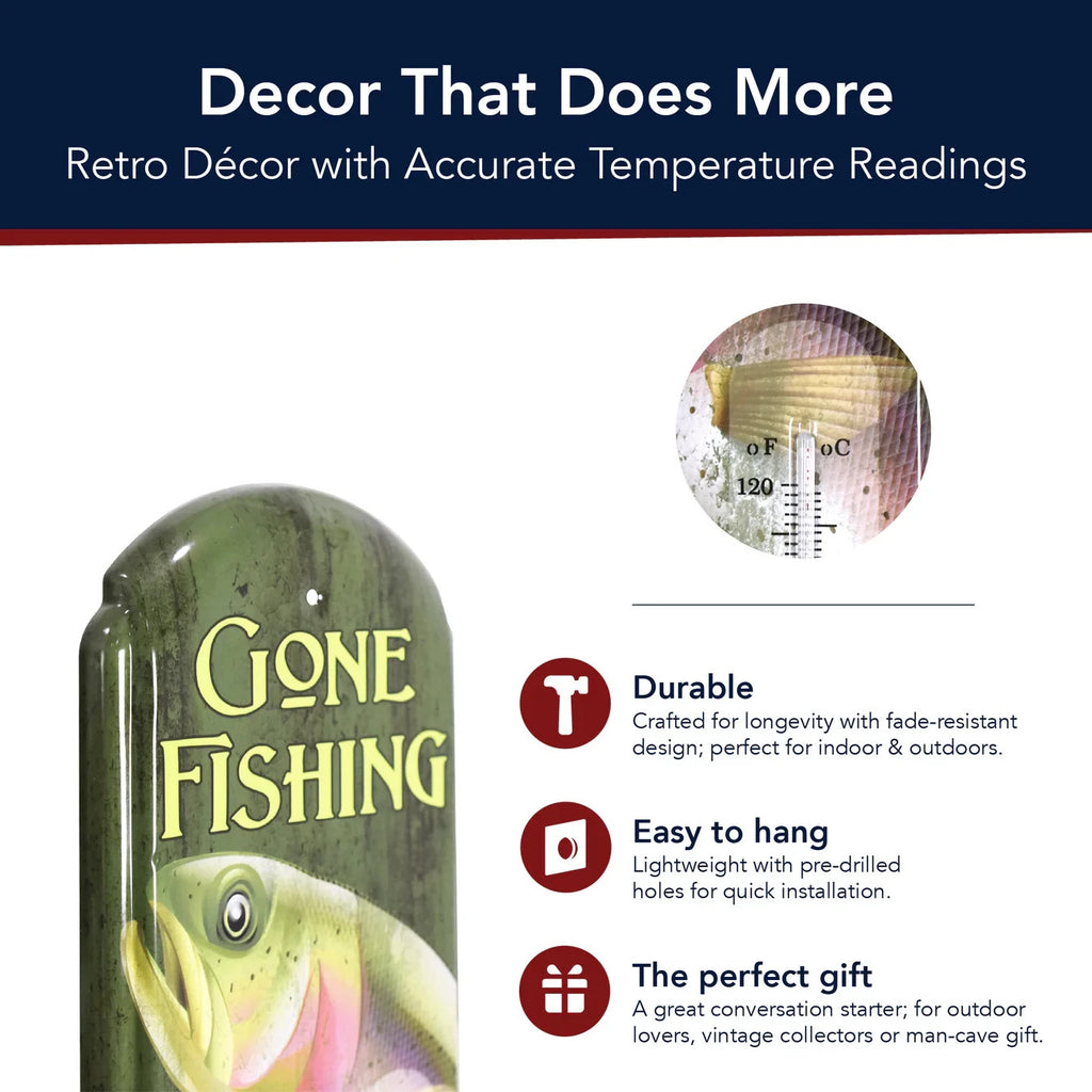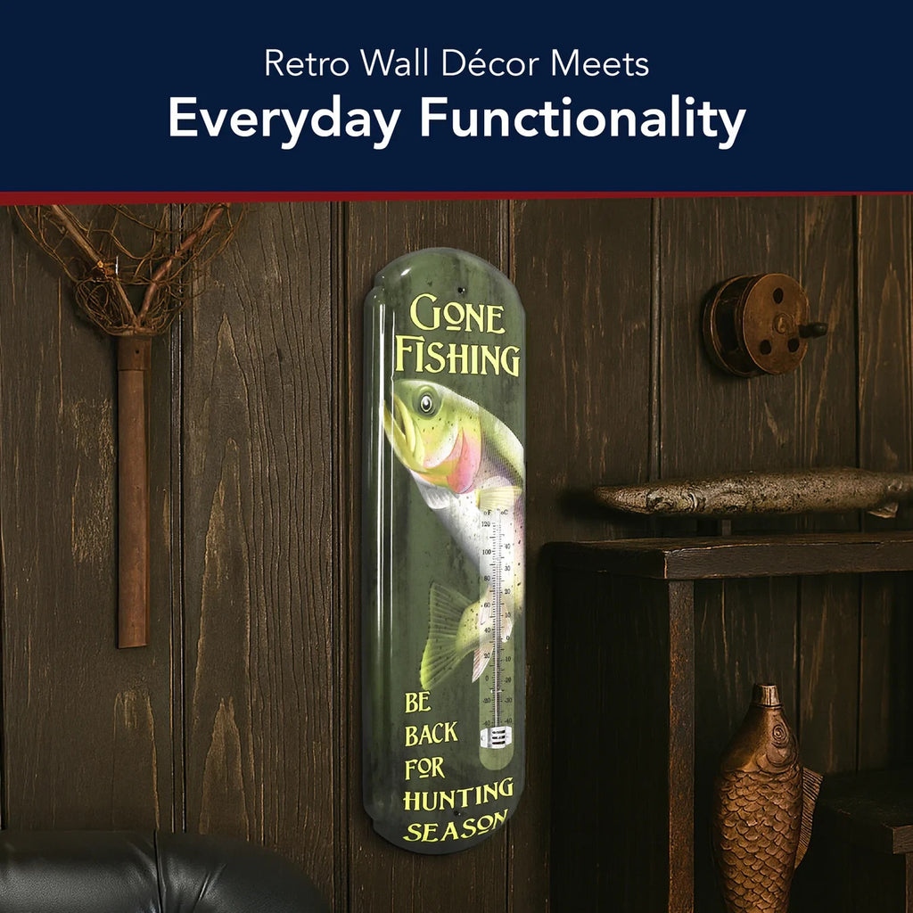 Bring the spirit of the outdoors inside. This officially licensed “Gone Fishing” thermometer sign features a vivid trout illustration, rustic green-brown patina, and the phrases “Gone Fishing” and “Be Back for Hunting Season.” It’s a perfect fit for porches, cabins, game rooms, garages, man caves, and hunting lodges.