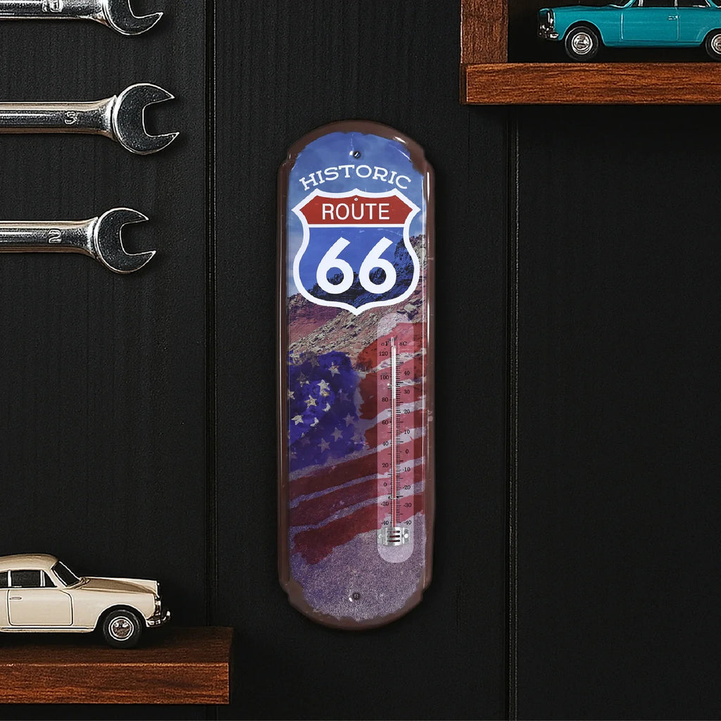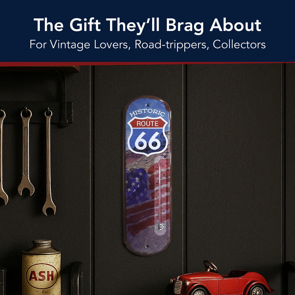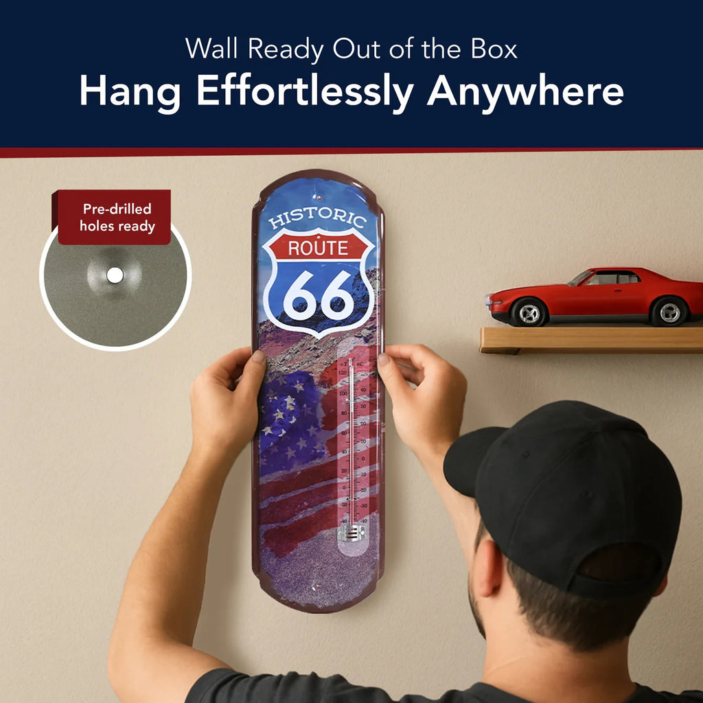 Bring classic road-trip vibes to your space with this vintage-style Route 66 thermometer sign. The embossed metal plaque showcases the iconic Historic Route 66 shield over a rugged desert landscape and weathered American flag—perfect for Americana décor in garages, man caves, home bars, game rooms, or covered patios.