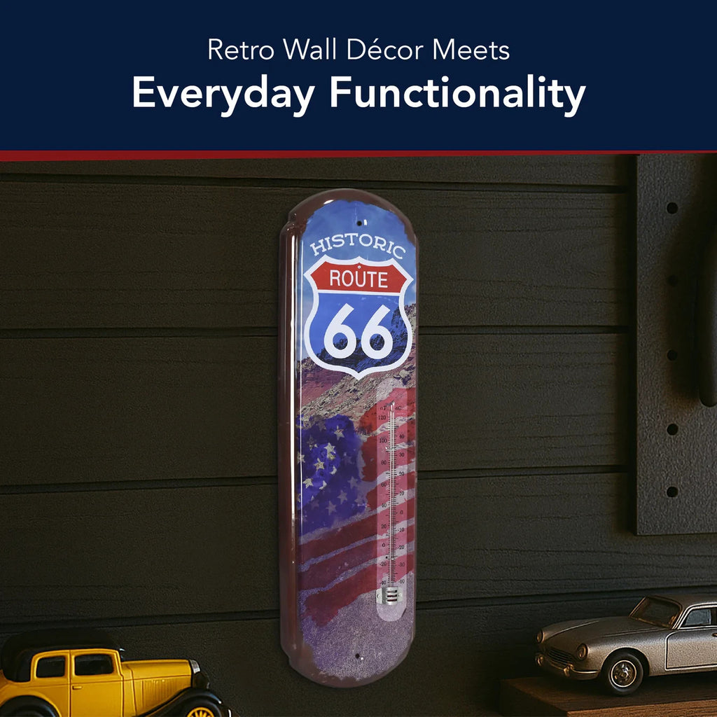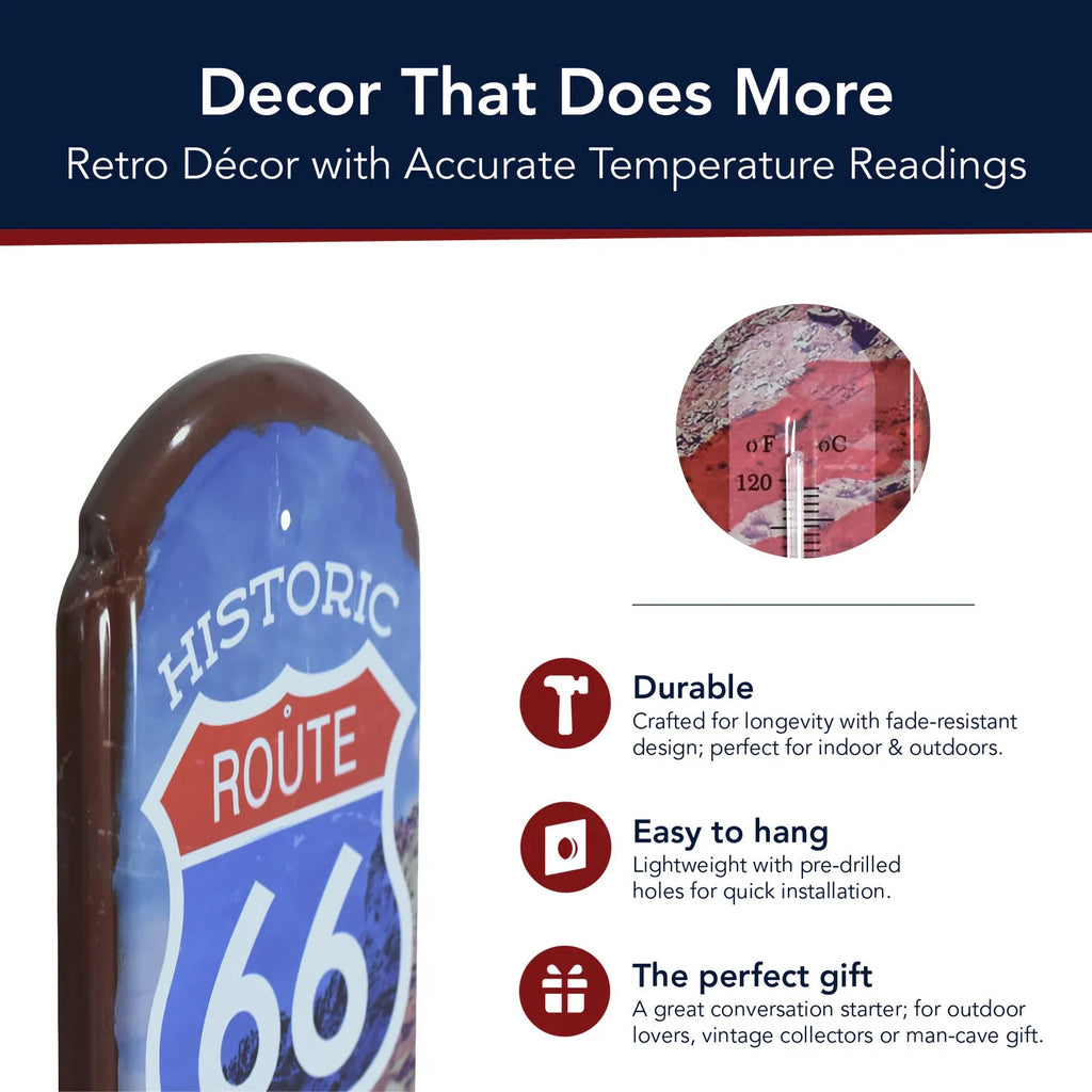 Authentic Americana design + practical temperature readings in a durable, ready-to-hang piece—an easy upgrade for Route 66 fans and vintage décor lovers.