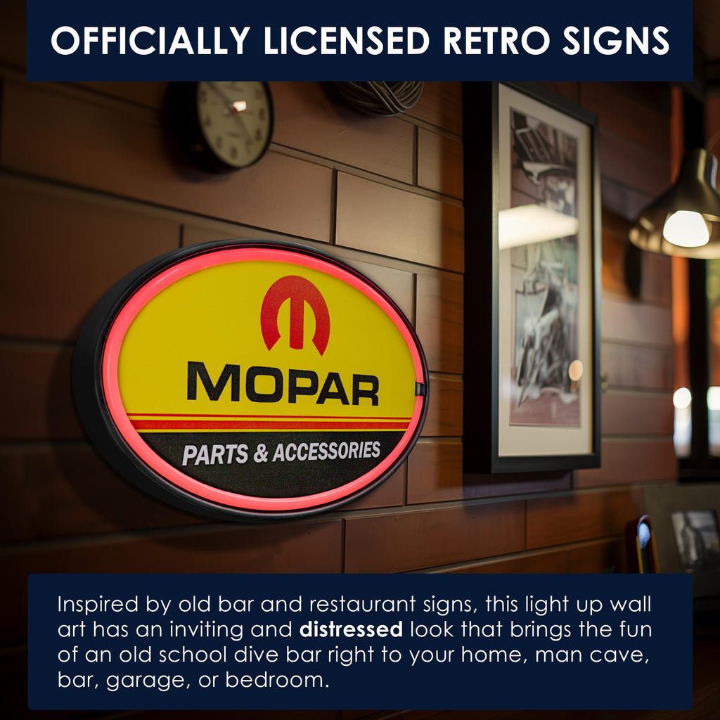Calling all Mopar bros! Complete your Chrysler collection with this neon-style LED wall sign. The oval design wraps the Mopar logo in a bright red LED border that pops against the bold yellow face—delivering retro shop vibes without the noise, heat, or fragility of old-school neon. Whether it’s lighting up your home bar, man cave, garage, or office, this piece adds instant character and warm ambient glow.