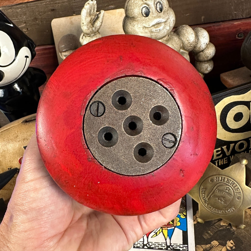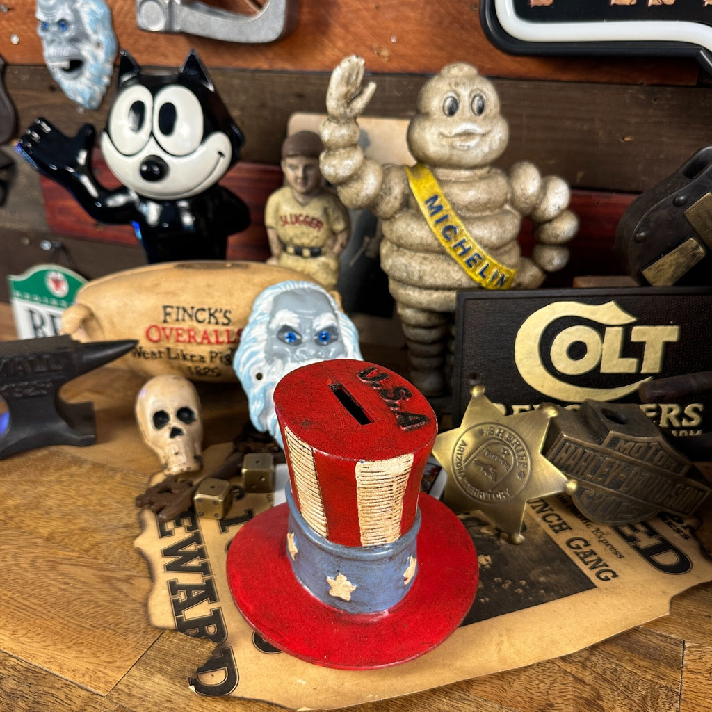 Add a touch of Americana charm to your shelf, desk, or coin collection with this handcrafted patriotic hat coin bank. Modeled after Uncle Sam's iconic top hat, this piece boasts a painted antique finish in bold red, white, and blue, complete with embossed stars and "U.S.A" on the top. Made from solid cast aluminum, this bank is built to last and heavy in hand, giving it the feel of a true vintage collectible.